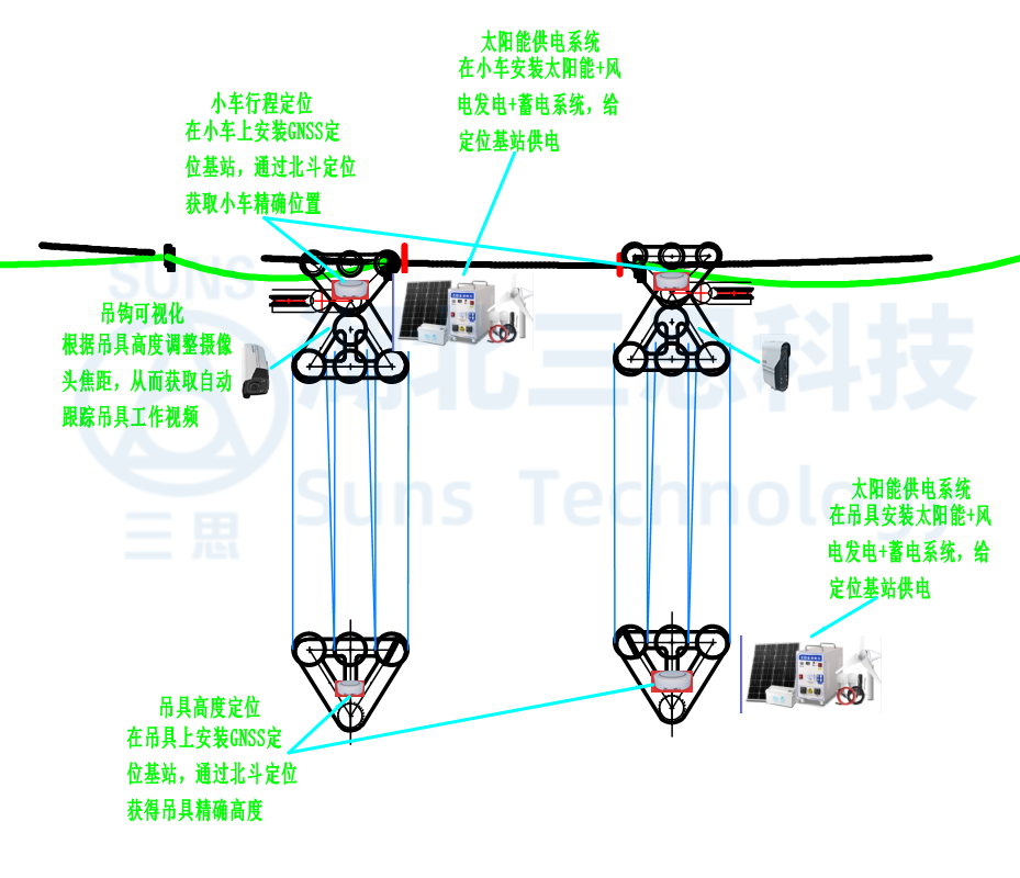 吊鉤可視化系統(tǒng)通過在小車上安裝向下照射的高清攝像頭照射吊具,攝像頭通過安裝在小車上的太陽能+風電供電系統(tǒng)持續(xù)提供電能,可實現(xiàn)24小時不間斷監(jiān)控,夜間也可實現(xiàn)對吊具的監(jiān)控。