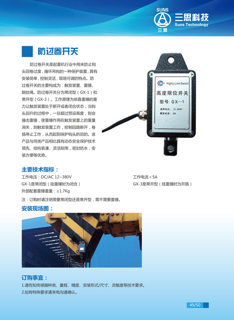 防過(guò)卷開(kāi)關(guān)是起重機(jī)行業(yè)中用來(lái)防止鉤頭回卷過(guò)度,撞壞吊鉤的一種保護(hù)裝置,具有安裝簡(jiǎn)單、控制靈活、現(xiàn)場(chǎng)可調(diào)的特點(diǎn)。防過(guò)卷開(kāi)關(guān)的主要構(gòu)成為:觸發(fā)裝置、重錘、鋼絲繩。防過(guò)卷開(kāi)關(guān)分為常閉型 (GX-1)和常開(kāi)型(GX-3)。工作原理為依靠重錘的重力讓觸發(fā)裝置處于斷開(kāi)或者閉合狀態(tài) ,當(dāng)鉤頭回升的過(guò)程中,一旦超過(guò)預(yù)設(shè)高度,則會(huì)撞擊重錘,使重錘作用在觸發(fā)裝置上的重量消失,則觸發(fā)裝置工作,控制回路斷開(kāi),卷?yè)P(yáng)停止工作,從而起到保護(hù)鉤頭的目的。該產(chǎn)品與同類產(chǎn)品相比具有動(dòng)態(tài)安全保護(hù)技術(shù)領(lǐng)先、結(jié)構(gòu)緊湊、靈活耐用、密封防水,安裝方便等優(yōu)勢(shì)。