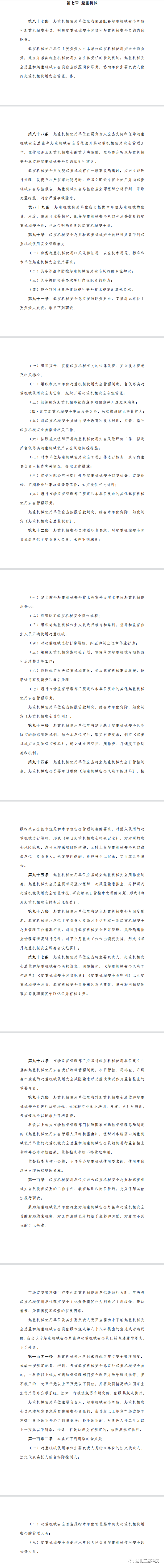以下是《特種設(shè)備使用單位落實(shí)使用安全主體責(zé)任監(jiān)督管理規(guī)定》第七章針對起重機(jī)械做出如下規(guī)定:
